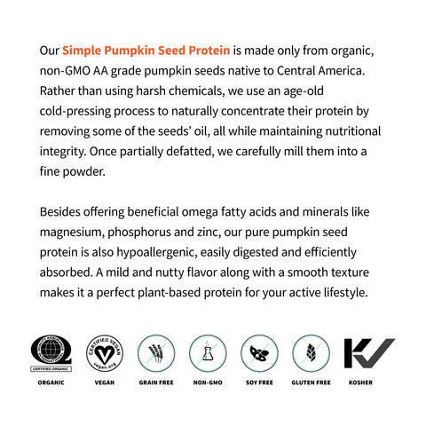 Pure and hypoallergenic, Simple Pumpkin Seed Protein is a great option for those looking to keep it, well, simple. Neutral in flavory with a slight hint of nut, it blends well into anything imaginable - from a green smoothie to a stack of banana pancakes. Feel free to make it your own and get creative! While it can be enjoyed at any time of the day, we recommend adding it to your post-workout routine (30-60 minutes after) to maximize those fitness results.