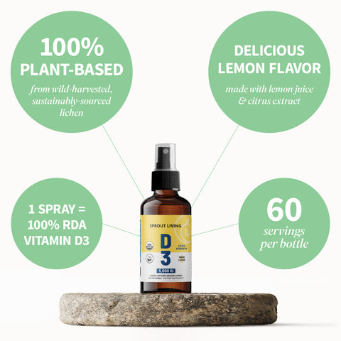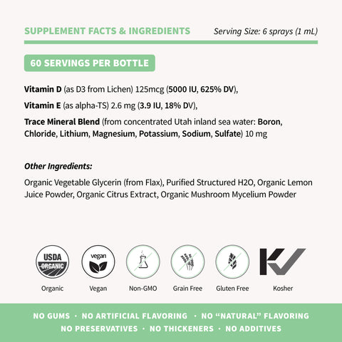 - 5000 IU D3 (625% DV) from plant-based lichen (not sheep's wool)
