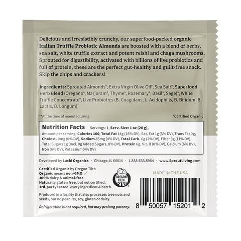 Italian Truffle Probiotic Almonds are the perfect guilt-free snack. They're loaded with nutrients, sprouted for digestibility and packed with flavor from white truffle extract and other superfood herbs and spices.